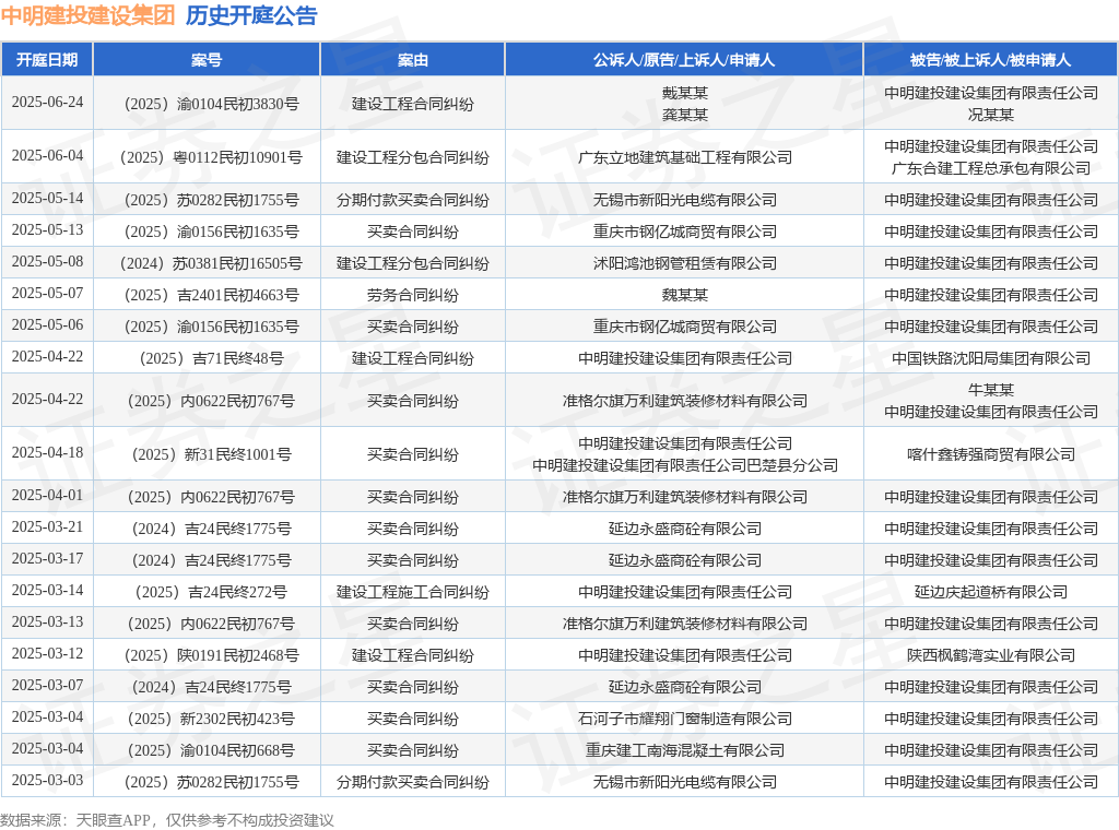 本站消息,根据天眼查APP显示,近日公布了一则中明建投建设集团有限责任公司作为被告/被上诉人的开庭公告,详细内容如下: